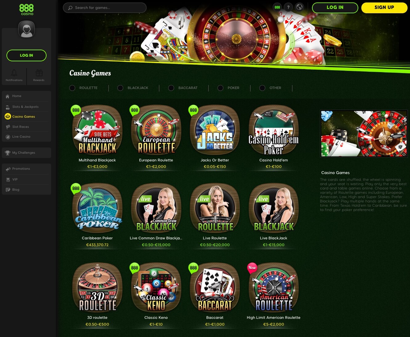 Los juegos de mesa en 888casino incluyen blackjack en línea, ruleta en vivo, video póker en línea y tarjetas rasca y gana. Hay numerosas variantes de cada uno, pero faltan algunos juegos, especialmente keno y dados. El bingo también está prácticamente ausente.